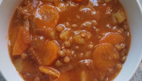 Rehogamos unos segundos y añadimos el tomate frito, las patatas, zanahorias, tomate, el resto de especias, y las lentejas previamente lavadas y escurridas. Cubrimos de caldo vegetal y dejamos hacer a fuego medio.