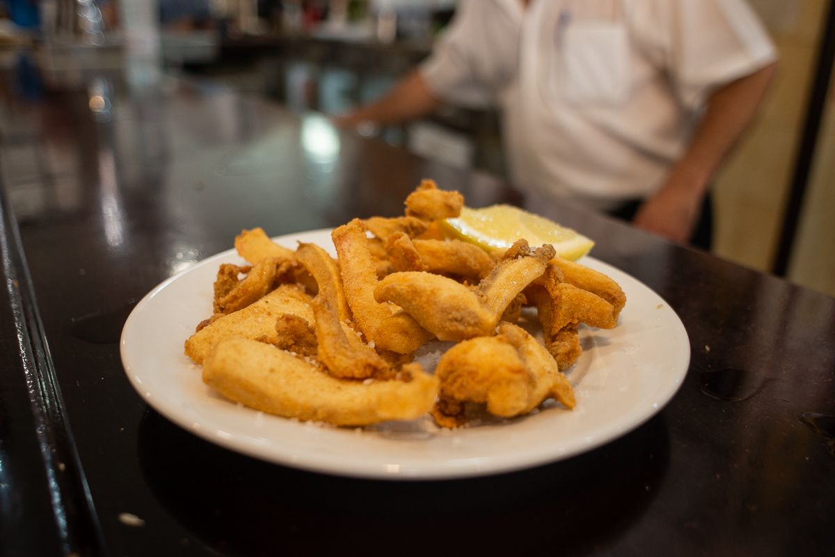 El pescado frito y los mariscos cocidos están muy presentes. Corvina, doradas, robalos, langostinos, quisquillas o camarones de porreo. “Filetitos, cazoncito, chocos, salmonetitos y las cachuelas de los conejos, que es la asadura del conejo de campo a la plancha con dos pedacitos de pan, está muy bueno”, comenta mientras salen platos cada dos por tres. Pero lo que más reclama su público es a su estrella, las almejas, que el cocinero Salvador Cáceres llevó a la fama gracias a un truco: un toque de manzanilla de Sanlúcar y otro de amontillado de Jerez.
