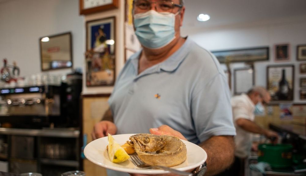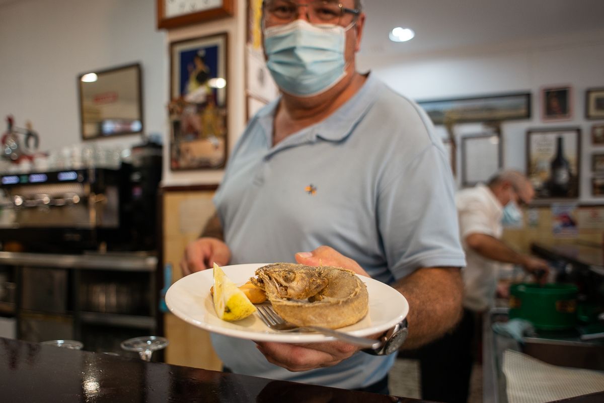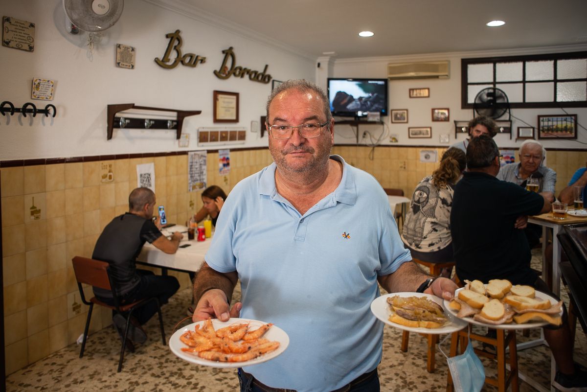 El trasiego de vecinos invade un local que se sitúa frente al mercado de abastos de Puerto Real. Gentío, saludos calurosos, conversaciones a viva voz y panzas hambrientas se reúnen en el bar Dorado, un clásico de la gastronomía puertorrealeña donde el revuelo, controlado por las medidas de seguridad, demuestra la vida que sigue conservando.