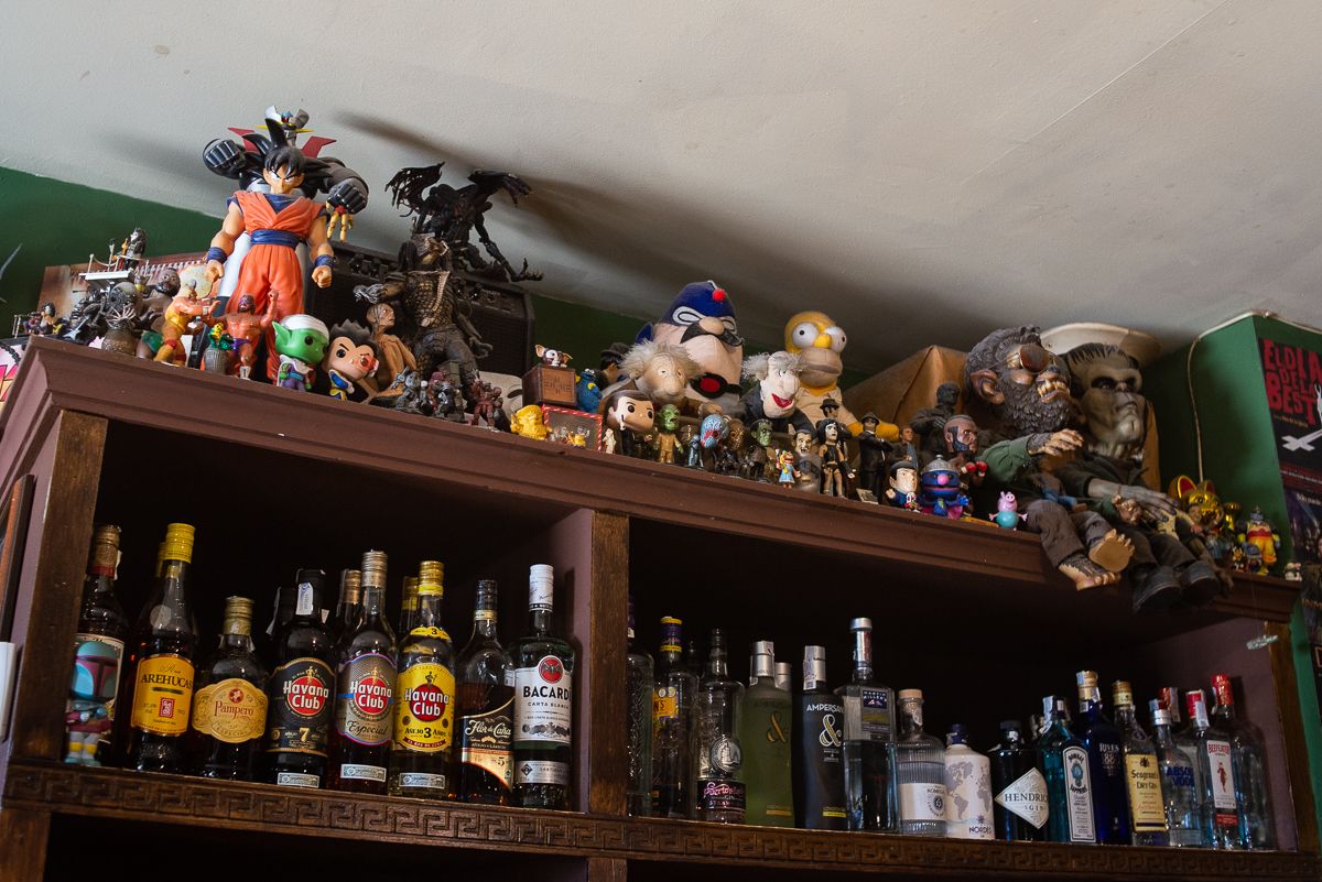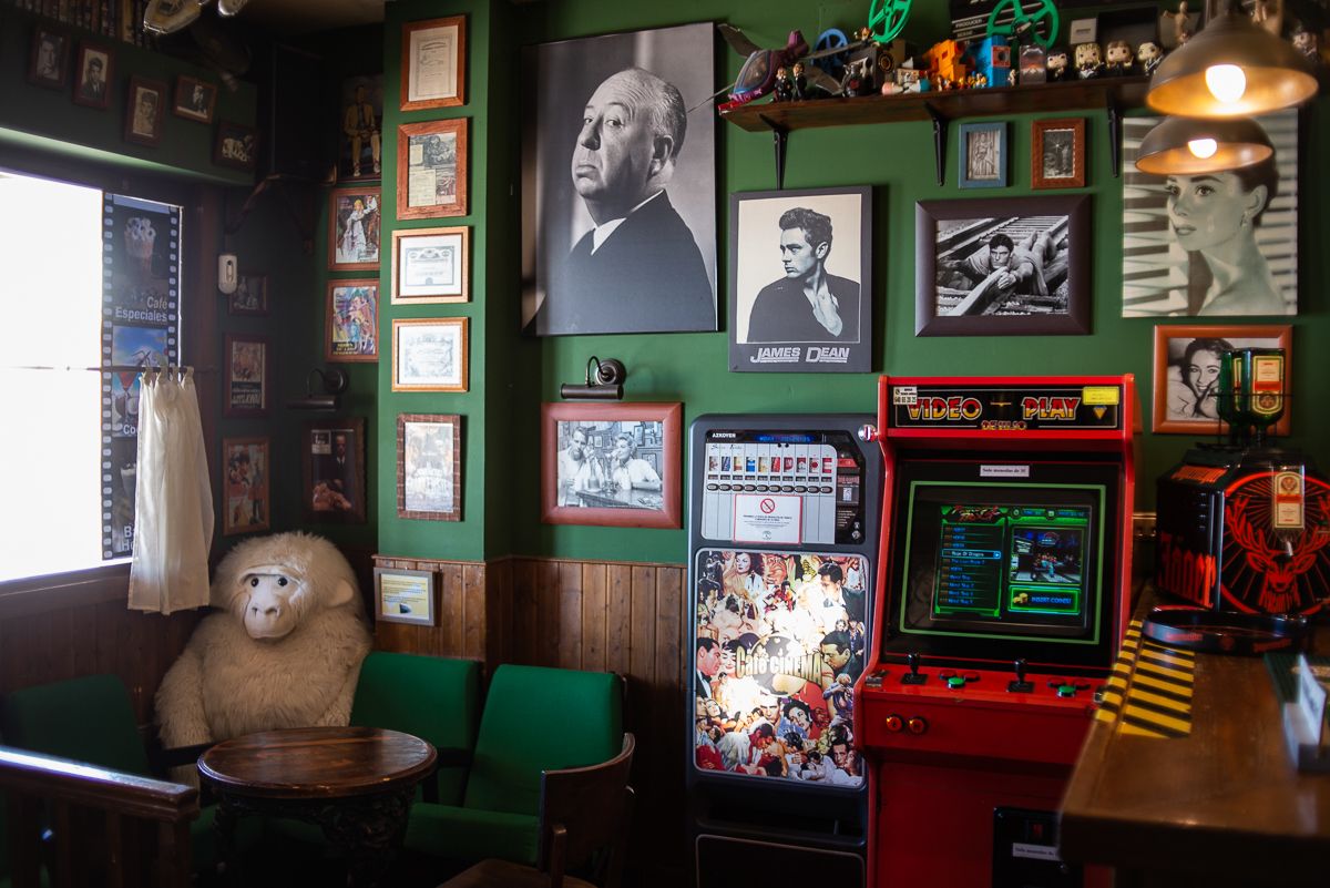 Entre las paredes del Cinema también hay numerosas “figuritas” y carteles de películas como 2001: una odisea del espacio, E.T. El Extraterrestre o Batman. “Coria —el camarero del local— es muy friki, ha traído muchas cosas y ha hecho que la clientela también colabore", cuenta. Un Matzinger Z da prueba de ello. "El cinexin y el tomavistas de Super-8 es mío. Me he quedado con la espinita de actor, empecé a estudiar Audiovisuales pero las circunstancias me llevaron por otro lado", explica al lado de una máquina de marcianitos, que aunque no le renta mucho es parte de la decoración retro del local.