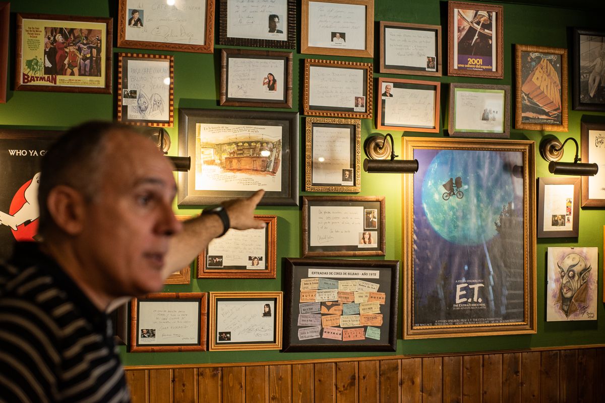 Con su socio, que le acompañó en el proyecto durante nueve años, dio forma al pub a raíz de la Escuela de Cine de Puerto Real, que se ubicaba justo enfrente. "Se juntó mi afición al cine ochentero a lo que vimos aquí al lado. Metí todas las historias que tenía por casa", explica mientras señala una fotografía de Bruto Pomeroy. El actor y activista cultural madrileño, afincado en Puerto Real, amigo y cliente habitual del local, regenta ahora la Escuela de Cine de la UCA, relevo natural de la extinta puertorrealeña.