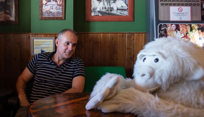 Para entender el asunto, basta con echar un vistazo a las redes sociales del pub. De invitado en Taxi Driver o en Bienvenido Mr. Marshall, el mono blanco del Café Cinema es una celebridad local. “Un día apareció un camarero con el gorila subido encima suya. Me dice: 'quillo, me asomé por la ventana y lo vi en un contenedor de basura'. Se vino y lo trajo aquí. Iba a ir a la basura pero la gente no paró de hacerse fotos y alguna mente brillante cogió un folio y puso: recogida de firmas para salvar al mono blanco. Ahí lleva como 15 años”, ríe.