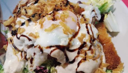 Hay tres tipos de ensaladas, la César con pollo y bacon, la de cogollos y atún y la que finalmente pedimos, con pollo crujiente y salsa ranchera (9 euros, como el resto). A simple vista aparecen el pollo empanado a tiras, la lechuga y la lombarda, trozos de cebolla frita, un rastro de reducción de algo y en todo lo alto un huevo frito. Por originalidad no será. Todo mezclado está bien de sabor, la lechuga fresca y crujiente combinada con la yema y la clara del huevo frito, el crujiente de la cebolla y del pollo… Recomendable.