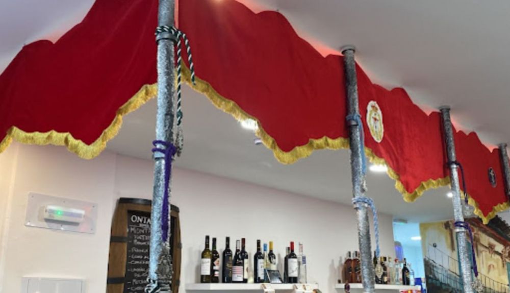 La barra de este local, situado en la plaza Santa María de Écija (Sevilla), está montada como si fuese un palio. Entre varales se sirven tapas y bebidas.