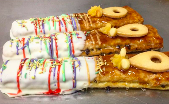 Son pitos de Carnaval, a base de capas de hojaldre y pasta brisa, aunque no lo parezca. Esta idea nace en el Obrador Fierro, ubicado en Puerto Real, con motivo de crear un dulce en sintonía con la fiesta popular gaditana. Un postre de unos 15 centímetros de largo y 200 gramos que podrán acompañar con una copita de Canasta.