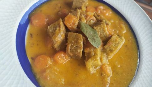 7. Lo dejamos cocinándose a fuego medio-bajo hasta que la zanahoria y la patata estén listas. Añadimos la zanahoria cortada a la salsa, y también el seitán.