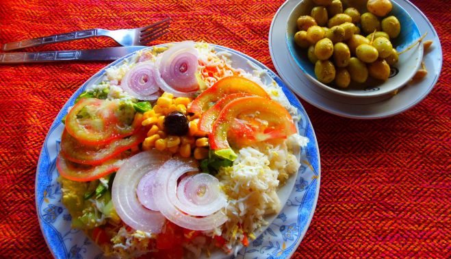 Por último, mención especial para una ensalada de tomate, cebolla y pimiento (vamos, el picadillo andaluz), pero que estaba aderezado, además de con aceite, con comino. Esta especia es de las pocas que no terminan de convencerme, y que siempre uso son mucho sigilo, pero en aquella terraza de Telouet, un remoto pueblo del valle de Ounila, me supo a gloria.