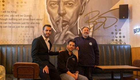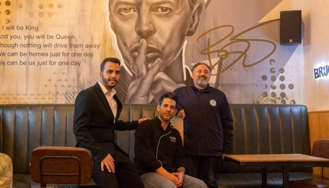 Un grafitti enorme de David Bowie recuerda que el local “es transgresor” junto a un fragmento de la letra Heroes, canción del duodécimo álbum del compositor.