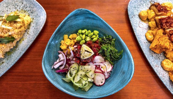 En la carta del Tirabuzón destacan los platos tradicionales. Pero no sólo eso. No faltan las ortiguillas —aquí se sirven fritas con alga wakame y ralladura de lima—, la caballa, las almejas o las tortillitas de camarones. Pero también se nota la mano del chef. La ensalada tirabuzón lleva miel, mostaza, pollo frito, queso de cabra, nueces y pipas de calabaza; está el poke bowl de Santa María, con atún rojo o salmón, arroz basmati aliñado, piña, rabanito, alga wakame, pepino, edamame y cebolla morada; la pata de pulpo a la plancha con patata rota, bizcocho salado de pimentón y mojo rojo; o el wok de verduras con fideos de arroz.