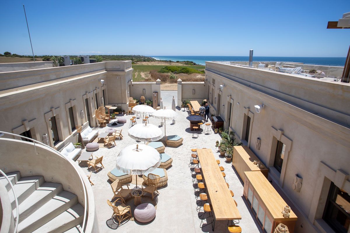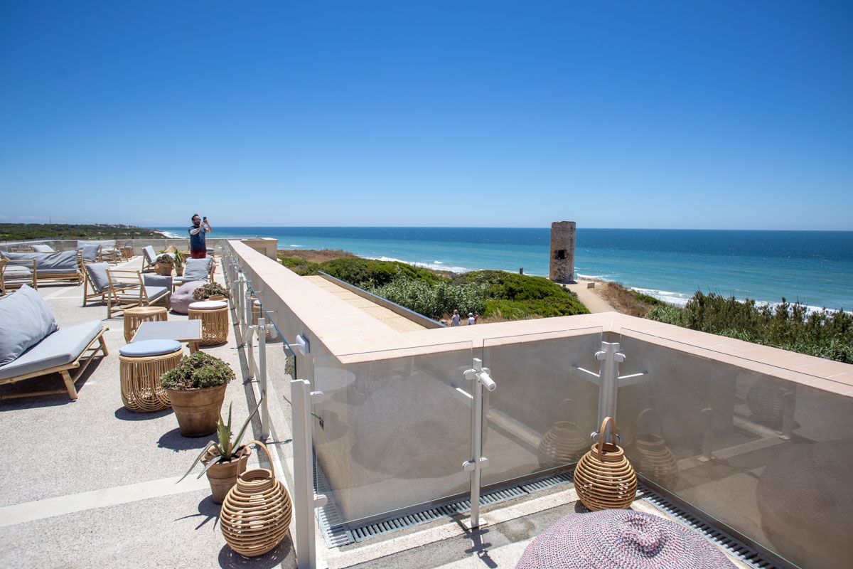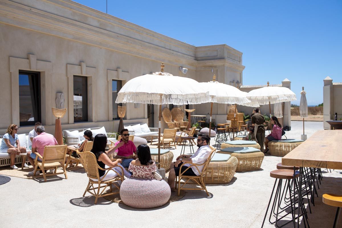 La primera apuesta del madrileño Grupo Azotea por Andalucía —pronto llegará la terraza del nuevo Hotel Radisson en La Magdalena, en Sevilla— no puede acumular más ingredientes atractivos. Desde su emplazamiento, un antiguo acuartelamiento rehabilitado junto a la fina arena de la Costa de la Luz, construido a finales del siglo XIX y que acabó en ruinas tras década y media de abandono, hasta una potente carta de almuerzos y cenas firmada por el chef ejecutivo del grupo, Manuel Berganza, donde mandan el mar y los productos de la tierra. A eso se une una colección de coctelería que prepara con esmero Anastasio y su equipo, y un interior donde la decoración de Alejandra Pombo se basa en la sencillez del mortero de cal típico gaditano, tan contenida como elegante.