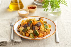 Para comenzar con nuestro menú andalusí, vamos a hacer una alboronía. Este plato, que probablemente sea de origen mozárabe, fue consumido por las clases más populares en la Edad Media. Con el descubrimiento de América, se introdujeron en él ingredientes como el tomate, el pimiento o la patata, llegados del Nuevo Mundo. Algo similar a lo que sucedería en otros platos de nuestra tierra, como el gazpacho o el ajo campero o de viña.De esta forma, para su versión actual, necesitamos un cuarto de kilo de calabaza, otro cuarto kilo de berenjena, un tapin (calabacín blanco), media cebolla grande, un pimiento verde, un tomate, una manzana o membrillo, pimentón, aceite de oliva, pimienta y sal. Para su elaboración picamos la cebolla, el tomate y todas las verduras en daditos. Si está pensando que guarda cierto parecido con el pisto, no se extrañe.