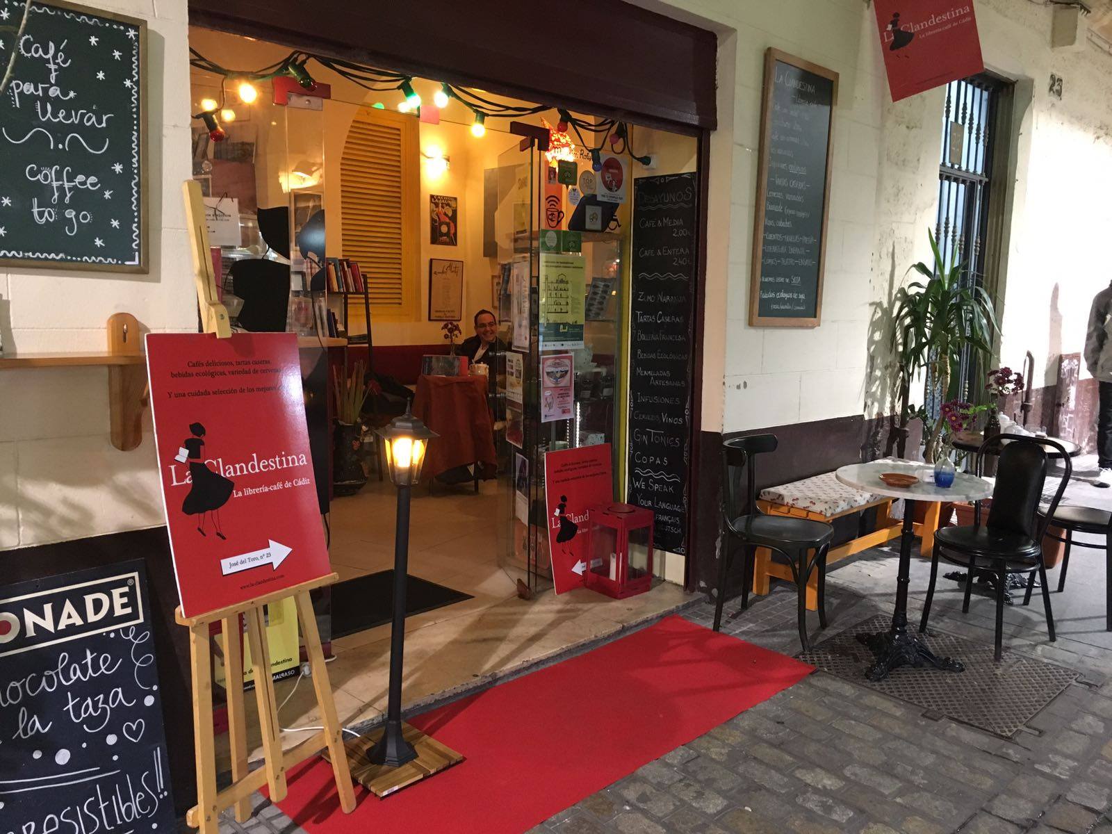 En la confluencia de dos calles –José del Toro y Cardenal Zapata- La Clandestina librería-café se ha hecho un hueco entre la oferta de sitios con encanto de Cádiz. Nueve años hace ya que María Martín-Arroyo y su hermana se decidieron abrir este coqueto establecimiento que ya se ha convertido en una cita obligada en la capital. Pero no ha sido fácil. La experiencia de María en la hostelería se limitaba a haber trabajado alguna que otra de vez de camarera pero pensó que sería una salida laboral. Estudiante de Biología y natural de Rota, María quería establecerse en la capital y barajaron en primer lugar una librería con editoriales alternativas que no son fáciles de encontrar. El riesgo era grande, así que sumaron a este propósito una cafetería para asegurar ingresos. Y la fórmula, triunfó.