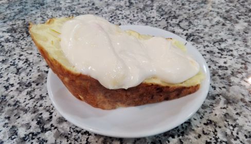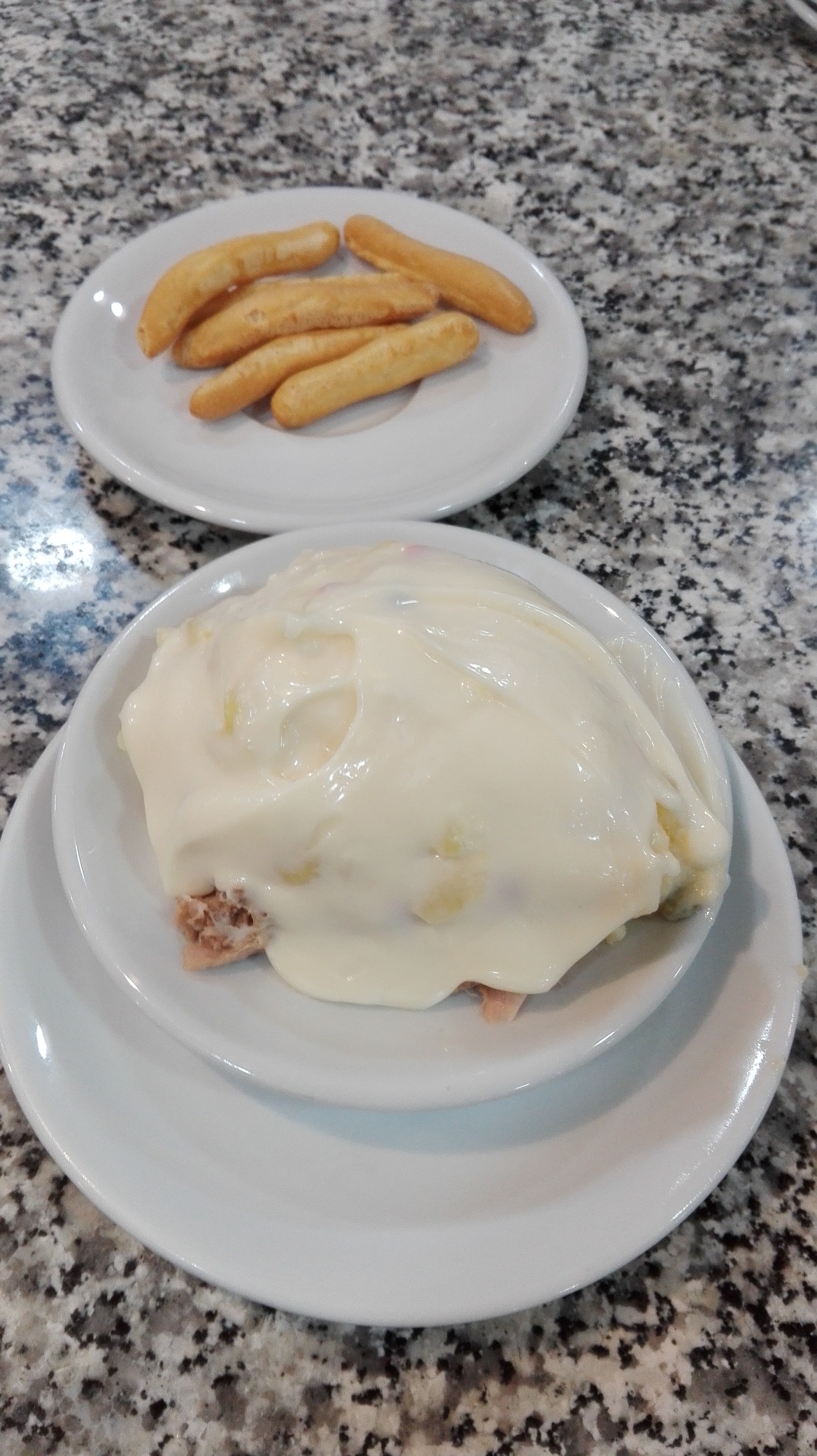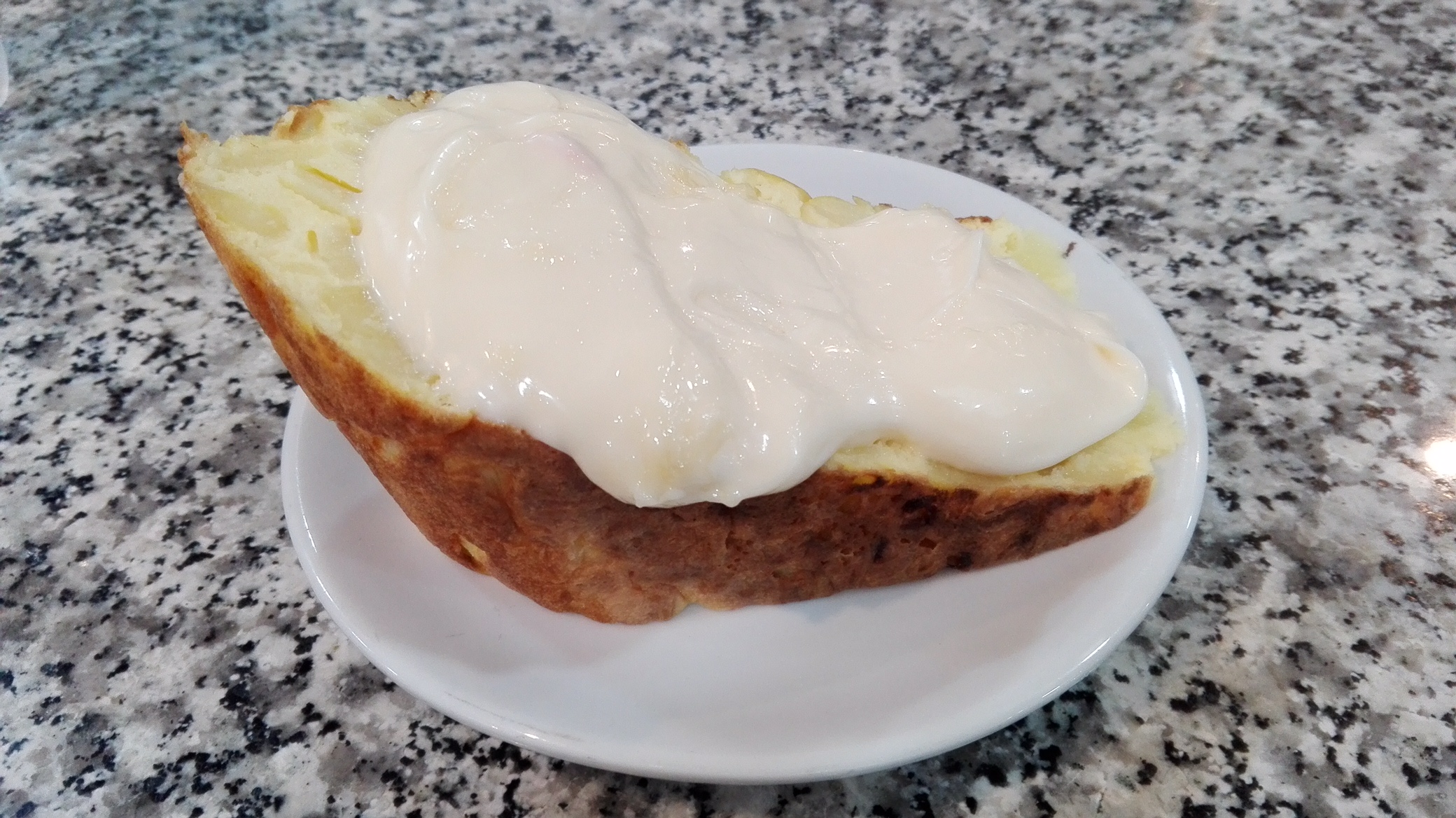 “Parece mentira, Paco”, le espeto. A continuación, le pido que ponga en fila india, como en el colegio, una tapa de tortillón y otra de ensaladilla. La tortilla ha estado más tiempo del habitual en la sartén, por lo que la cuña que me sirve Paco está algo más dorada de lo normal, pero sin llegar a amargar. Aun así, el interior está jugoso. Con la patata y el huevo en su punto de cocción y de sal. La mayonesa le da el toque de siempre. Sigue siendo la tapa reina del Maypa desde mediados de los cincuenta. Con sus picos, por supuesto, de la panificadora de Pedro Bazán.
