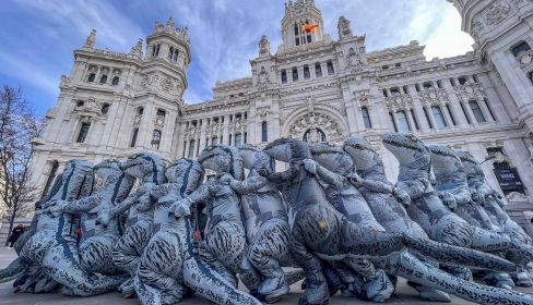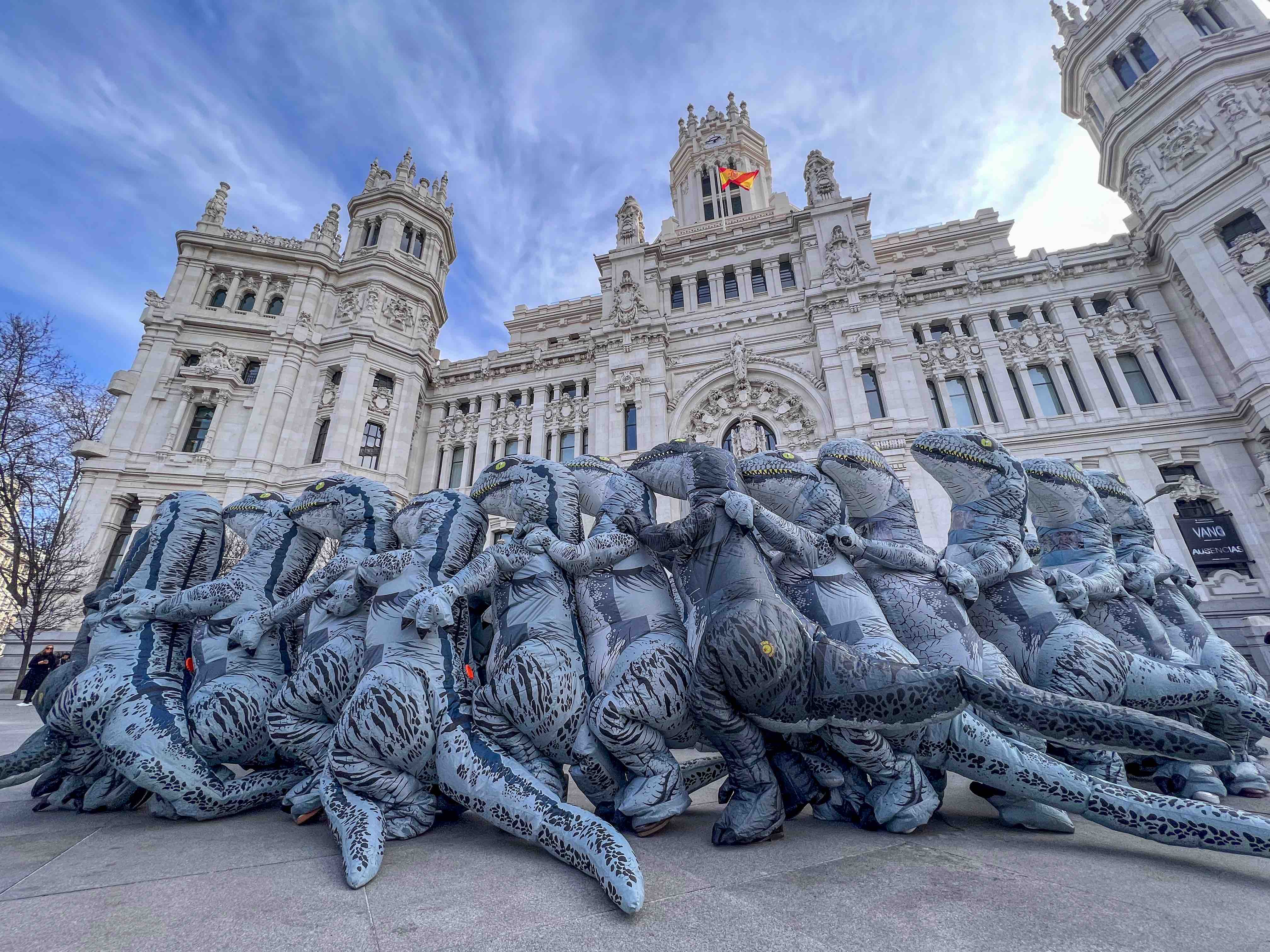 Hace unas semanas una surrealista imagen invadía la capital. Un grupo de dinosaurios que caminaban por las calles de Madrid. Una escena insólita que hizo que más de una persona girara su cabeza para mirar dos veces. El colofón de esta iniciativa jurásica se ha producido hoy en Cibeles en la conocida como “Operación Rapto(r)”. Al más puro estilo V de Vendetta, los C-Raptors llamaron a sus fans a unirse a ellos en este emblemático enclave.
