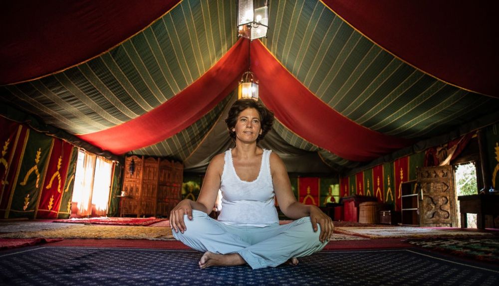 "La finca la diseñaron mis padres", dice Román. "Yo aparezco en 2017 cuando dicen que querían vender, y empiezo a adaptar el espacio como alojamiento rural". Primero en la choza, con capacidad para un máximo de seis personas, que imita la arquitectura típica de las gañanías que había en la campiña jerezana, donde residían jornaleros cerca de los cultivos que trabajaban. La yurta, de estilo mongol, imita a la utilizada por nómadas en Asia central, con una cama de matrimonio, chimenea y un amplio espacio a su alrededor. La jaima, colorida en su interior, está llena de alfombras. En ella se celebran sesiones de yoga o talleres de movimiento expresivo, entre otras cosas.