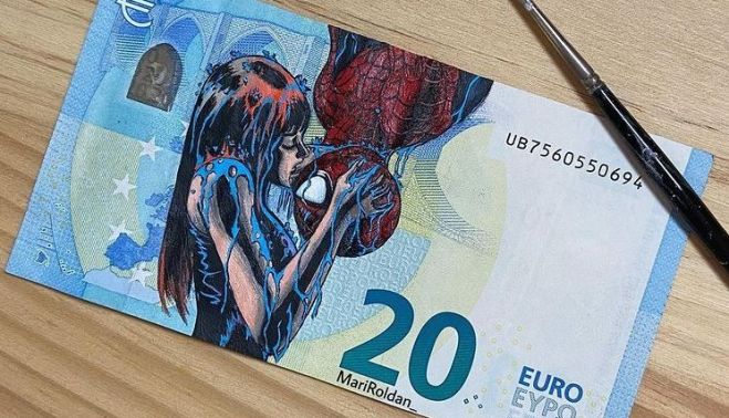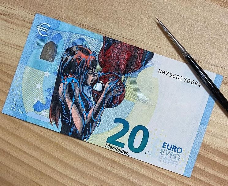 La malagueña de 26 años, Mari Roldán, amante de la pintura desde que era pequeña, fue rechazada por numerosas aerolíneas cuando vieron los tatuajes de sus brazos. Ante la negativa de viajar por el mundo como azafata, la joven decidió que sus dibujos lo hicieran por ella. Así, cogió billetes verdaderos de distintas cantidades y plasmó en ellos obras de arte.