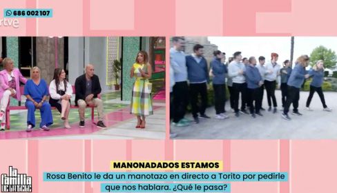 Patiño, tras la presentación de todos los concursantes, le pedía a Torito si podía ponerle el micro a Rosa Benito y preguntarle qué tal se siente "en esta nueva familia en la que estamos todos, ya que ahora somos de alguna manera todos hermanos de cadena". Cuando el reportero intentó explicarle que querían hablar con ella, la que fuera cuñada de Rocío Jurado le dio un manotazo a Torito.