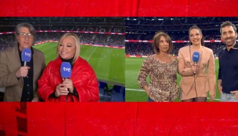 Juan Carlos Rivero, el narrador del encuentro, ha aparecido acompañado por la conocida popularmente como la princesa del pueblo. Desde el césped, Aitor Albizua, María Patiño e Inés Hernand, presentadores de La familia de la tele, programa que estrenará La 1 el 22 de abril, promocionaban dicho espacio.