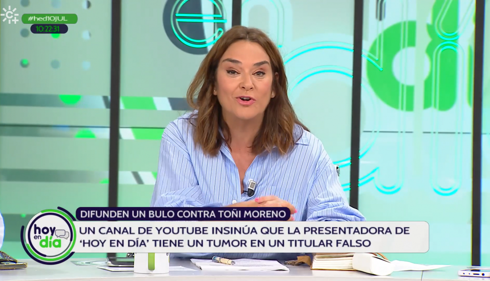 Toñi Moreno ha desmentido de forma tajante los rumores sobre un supuesto tumor, difundidos recientemente por algunos medios. La presentadora de Hoy en día, espacio matinal de Canal Sur, aprovechó el arranque de su programa este jueves para aclarar que la información difundida carece de veracidad y negó haber sido diagnosticada con ninguna enfermedad de este tipo.