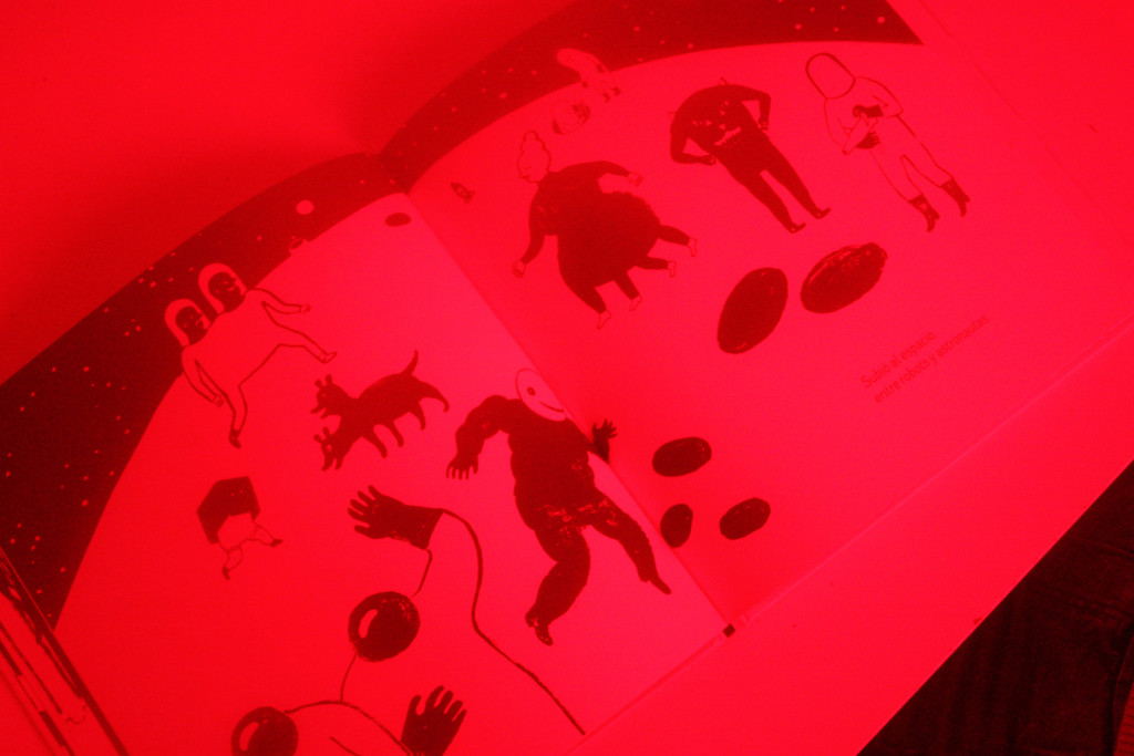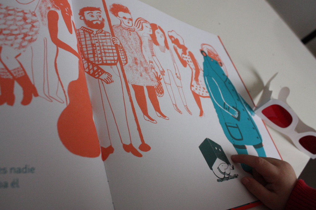 En esta historia una niña nos cuenta cómo su hermano pequeño cree que es invisible, y va por ahí con su caja de cartón creyendo que nadie lo ve. Pero también, si nos ponemos las gafas, las ilustraciones se transforman, y las mismas páginas nos cuentan la historia de un niño invisible que atraviesa mundos fantásticos, que va a la selva, al fondo del mar, ve a una sirena, a un dragón, a un oso muy grande… Con este juego de tintas que aparecen y desaparecen en las originales ilustraciones de Ana Pez, es como si pusiéramos un filtro a la realidad para verla desde los ojos y la imaginación de un niño. Son dos libros diferentes dentro del mismo libro.