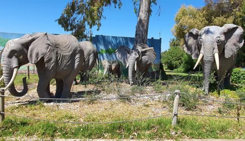 Entre los muchos rincones con historia en el Zoo de Jerez estará a partir de ahora el de los elefantes. Un grupo que se puede contemplar en la entrada principal y que formaba parte de un parque infantil del Hipercor en la ciudad, justo detrás del edificio del centro comercial y donde hoy hay un aparcamiento. Esta firma, con muy buenas relaciones con el Zoo, cedió el grupo que se puede admirar en el lugar mencionado.