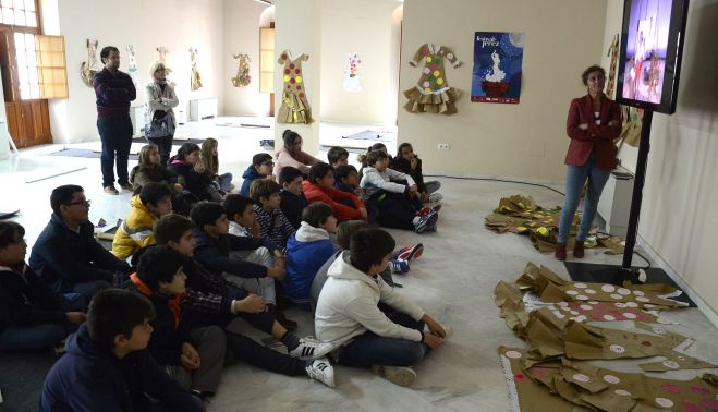 Este taller, destinado al alumnado de ocho colegios de primaria de Jerez, está organizado por la empresa Monto Cultura y se desarrolla en el Palacio de Villapanés. “Se basa en una metodología lúdica, motivadora, atractiva y participativa, cuya finalidad es acercar el flamenco y la figura de Lola Flores a los más pequeños de forma amena y divertida”, explican los responsables de la empresa. Después de la proyección de un vídeo sobre La Faraona para contextualizar el taller, los pequeños trabajan en varios grupos para la confección de una bata de cola con papel, pinturas y otros materiales didácticos. Han participado 50 alumnos de Segundo de Primaria del CEIP El Retiro y otros 50, de Sexto de Primaria del Colegio Albariza.