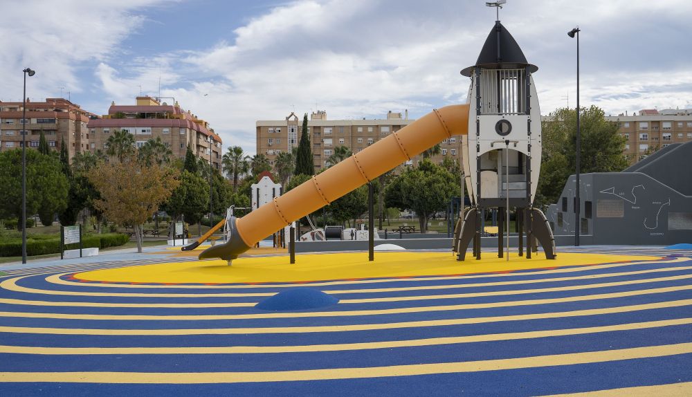 En concreto, está formado por tres zonas diferenciadas dentro de un mismo espacio. En una de ellas se ubica el llamativo tobogán de ladera de cinco metros de alturas y en las otras dos se han instalado juegos espaciales. En la parte más alta del parque se ha ubicado el cohete y en la parte baja se ha colocado como elemento principal una base espacial adaptada e integrada para el uso de niños con movilidad reducida.