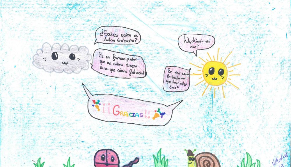 Este hombre se llama Antoni Gabarre, un pintor de muros muy bueno. Hasta hace poco teníamos en la entrada del centro un cuadro muy oscuro, que no nos transmitía nada. Así que decidimos que necesitábamos una nueva chispa de alegría en ese espacio. ¡Un nuevo cuadro! Por eso, llamamos a Antoni Gabarre, porque ya había pintado en nuestro cole otras veces. Y esos dibujos, sí que nos gustaban.