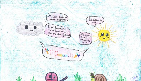 Expresa el respeto, la alegría, la felicidad. Sus dibujos de estilo infantil y abstracto, parecen garabatos, pero en realidad, en él se pueden ver a unos niños y niñas en el parque que hay enfrente de nuestra escuela, unas palmeras, unos montículos, unos pájaros, árboles… En definitiva, ha quedado precioso y te alegras un montón cuando lo ves. Me recuerda a los cuadros de Picasso o de Miró. Nos sentimos muy agradecidos por poder contemplar una obra de un pintor que ama su tierra y quiere enseñarnos a expresar nuestros sentimientos con el arte.