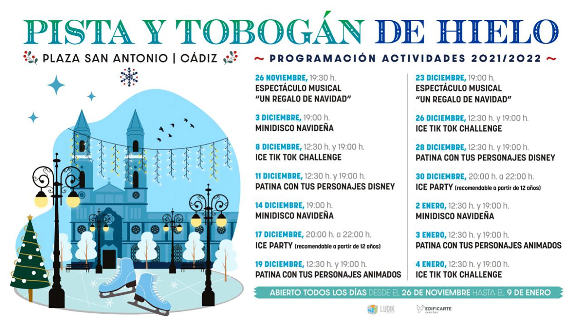 Cádiz capital vuelve a contar con la pista de hielo de la plaza de San Antonio que funcionará hasta el 9 de enero de lunes a jueves de 16.00 a 22.00 horas, los viernes de 16.00 a 23.00 horas y los sábados, domingos y festivos de 11.00 a 23.00 horas. Además de disfrutar del patinaje, se ofrece una programación de actividades.