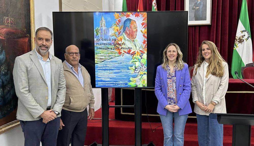 El alcalde de Trebujena, Ramón Galán, la delegada de Cultura, Alba Zambrano, y José Ceballos en representación de la Peña Cultural Flamenca La Trilla se han desplazado hasta la Diputación de Cádiz para presentar el cartel del XX Ciclo de Flamenco y Mosto que tendrá lugar los días 3, 10 y 18 de noviembre y que en esta edición está dedicado a la figura de José Pruaño, miembro fundador de la peña recientemente fallecido.