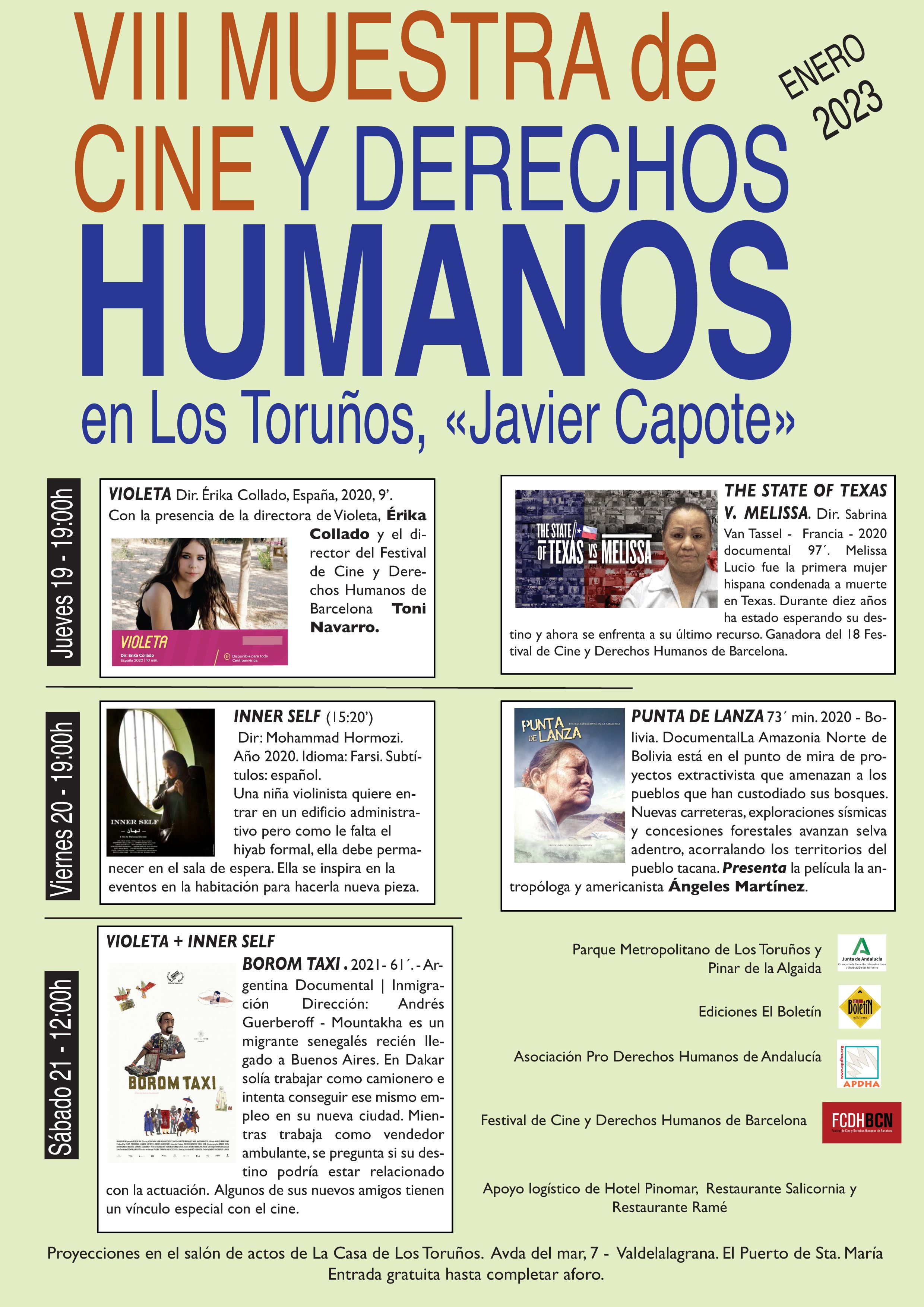 La Casa de los Toruños acogerá del 19 al 21 de enero la octava edición de la Muestra de Cine y Derechos Humanos Javier Capote, organizada por la Asociación Pro Derechos Humanos de Andalucía, la editorial El Boletín y la Consejería de Fomento, Articulación del Territorio y Vivienda, que gestiona el Parque Metropolitano Marisma de los Toruños y Pinar de la Algaida.