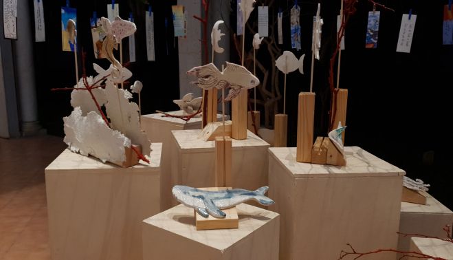 La exposición presenta un trabajo conjunto del alumnado del Bachillerato de Artes. Los estudiantes de Lengua Castellana y Literatura y Proyectos Artísticos han diseñado piezas cerámicas de fauna y flora marina e interpretaciones literarias ilustradas de la obra del escritor portuense.