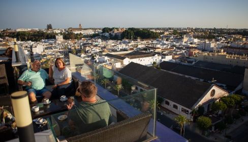 A vista de pájaro, una diminuta calzada de la duquesa Isabel destaca entre callejones. A lo lejos, el sol anuncia que en poco tiempo regalará un bonito ocaso. Desde arriba todo parece inmenso. La terraza del hotel Guadalquivir desvela rincones sanluqueños mientras una imponente Doñana se deja contemplar. Este espacio ubicado por las alturas es todo un emblema del turismo en Sanlúcar y el “skyline” por antonomasia de la localidad gaditana donde los sorbos de Manzanilla acompañan al galope de los caballos.