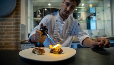 Tras la exhibición, no se quedan atrás su gyozas de carabineros cubiertas con emulsión de huevo frito y quinoa inflada, como si fueran palomitas de maíz. "Si voy a la Venta Esteban y me encanta el antojo, pienso cómo enfocar eso en la cocina japonesa. Así me invento propuestas como ésta", afirma el joven cocinero jerezano, orgulloso de que otros paisanos con estrella Michelin como Israel Ramos ya hayan catado Akase.
