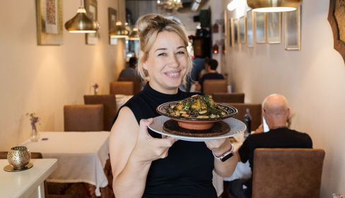 Además, han añadido los entrantes para que los comensales puedan picar algo mientras esperan sus platos. "La cultura de tapeo que existe en Andalucía no es incompatible con la comida árabe, por ejemplo, así que decidimos meterlo y está funcionando muy bien", indica. Así, han ideado, por ejemplo, una tabla con croquetas de cordero, falafel, humus y dátiles que se encuentra disponible para dos o cuatro personas y que cuenta con una versión vegetariana. "Como este tipo de comida utiliza tanta verdura nos resulta muy sencillo adaptarnos a estas necesidades", subraya la propietaria del local.