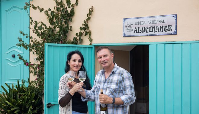 En esta tierra de vinos y de grandes bodegas, en el garaje de una vivienda, se esconde una aventura artesanal a más no poder que impulsó José Antonio Palacios hace ya cinco años, en 2019, y que regenta junto a su pareja, Mercedes García. Las palabras 'Bodega artesanal' y 'Alucinante', pintadas a mano en la fachada, dan la bienvenida al visitante, que al atravesar las puertas azules se encuentra con todo un universo bodeguero, pero 'en miniatura'.