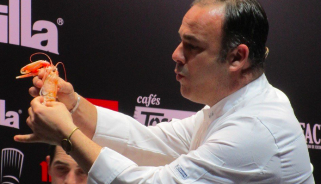 “Ahora el cangrejo de Cádiz, que no tenía ningún valor gastronómico, se puede comer. Y lo hemos hecho frito en un adobo. Se come absolutamente todo el bicho”, aseguró el chef jerezano. “A un cocinero gordito como yo de Cádiz lo que más me puede gustar es comer una galera, pero que no pinche. Por lo que le hemos metido las enzimas, la hemos pasado por la llama, cojo el interior de coral de la galera, la rellenamos y se deshace. En boca es una locura”, comentó durante su ponencia.
