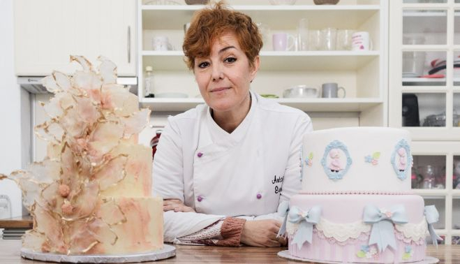En su obrador, ubicado en El Puerto, la pastelera de 43 años elabora un bizcocho genovés. A su lado, se observa un carrito repleto de pinceles y botes de todos los colores, propios de cualquier artista que realiza cuadros. En su caso, sus lienzos son la base de cualquier tarta y no se cuelgan, se comen. Su especialidad es la repostería creativa, piezas que ya ha cautivado no solo la vista sino también el paladar de muchas personas.