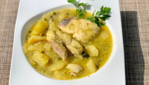 En la salsita que nos queda en la cazuela, echamos las patatas cascadas y los guisantes, las cubrimos de agua, y al cabo de unos quince minutos que estén tiernas, le ponemos por encima las rodajas de cazón para que se termine de cocinar.