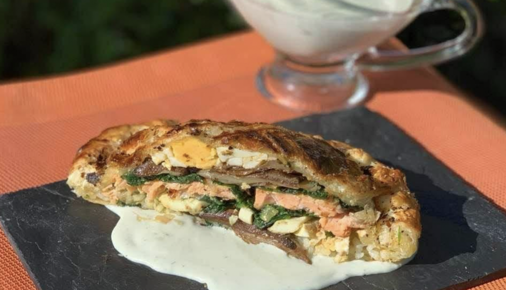 Extendemos la masa de hojaldre sobre una mesa de mármol enharinada y calculamos un rectángulo de masa que represente un tercio de la misma. Sobre este rectángulo extendemos por orden la mitad del arroz, la mitad de las cebollas derretidas, la mitad de la mezcla acelgas-espinacas, la mitad de los champiñones y la mitad de los huevos duros aplastados. Colocamos entonces los filetes de salmón y los recubrimos en sentido inverso de huevos duros, champiñones, acelgas-espinacas, cebollas y arroz.