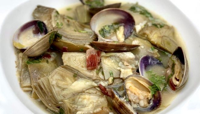 Ingredientes de la receta de alcachofas en salsa con almejas y jamón