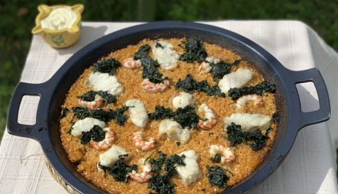 - Ponemos las espinacas, el rape y los langostinos por encima del arroz y presionamos ligeramente para que se metan dentro del mismo, pero sin remover.