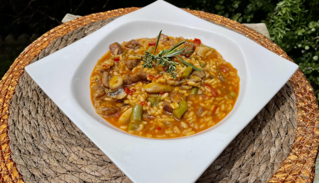 Es un arroz meloso con secreto ibérico al Pedro Ximénez, que hemos cocinado con setas y espárragos. Una delicia y ya veréis qué sencillo.