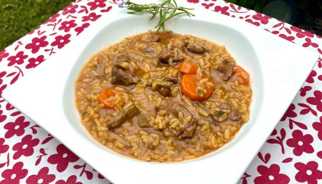 Ya sí que estamos notando el tiempo de otoño por lo que se refiere al viento y a la lluvia, aunque las temperaturas siguen siendo altas. Y ya sí que nos apetece un arroz otoñal de carrillada ibérica en salsa y tagarninas, que nos ha salido muy rico.