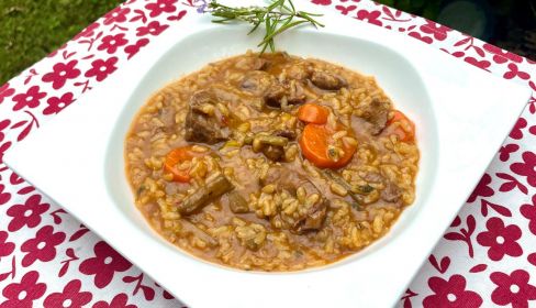 Esta semana tenemos a una invitada de Holanda, una querida amiga, Susan Dorst, que hacía 31 años que no nos visitaba en Rota, y como no puede comer ni pescado ni marisco, hemos optado por cocinar para ella este arroz meloso con carne y una verdura de temporada, como es la tagarnina. Cocinamos esta receta por primera vez, y la verdad es que nos ha sorprendido y nos ha encantado. Para repetir.