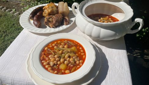 Ponemos en una fuente la carne, el hueso, la morcilla, el chorizo y el tocino y servimos el primer plato de la comida, que consistirá en los garbanzos, alubias, las tagarninas y las patatas.