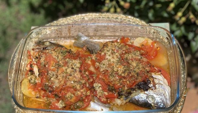 Terminado el sofrito de las verduras, lo ligaremos muy bien y se lo echaremos por encima a las doradas, hasta dejarlas cubiertas totalmente, menos las cabezas.