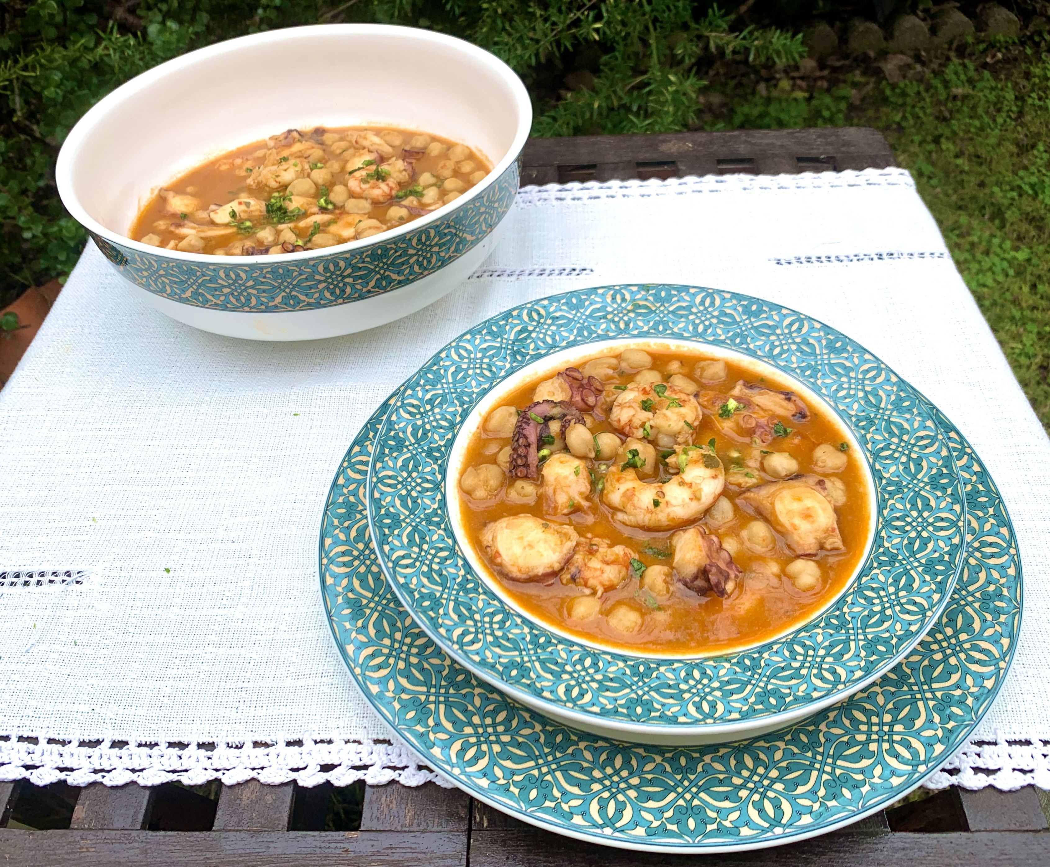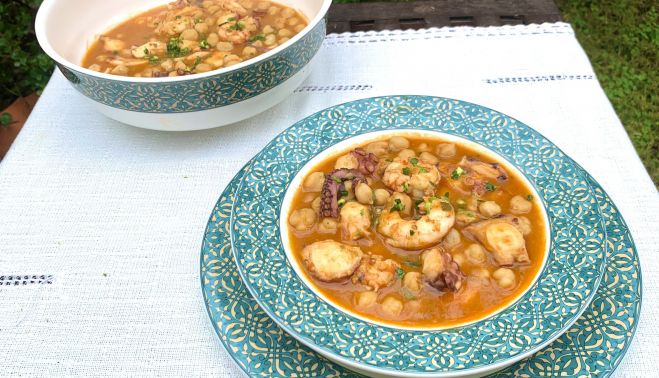 Hoy cocinamos y compartimos este guiso, que está riquísimo y sienta de maravilla. Es un guiso marinero, tierra y mar, de garbanzos con pulpo cocido y gambones. Además, se prepara muy rápido. Para los que tenéis menos tiempo, este guiso es ideal.