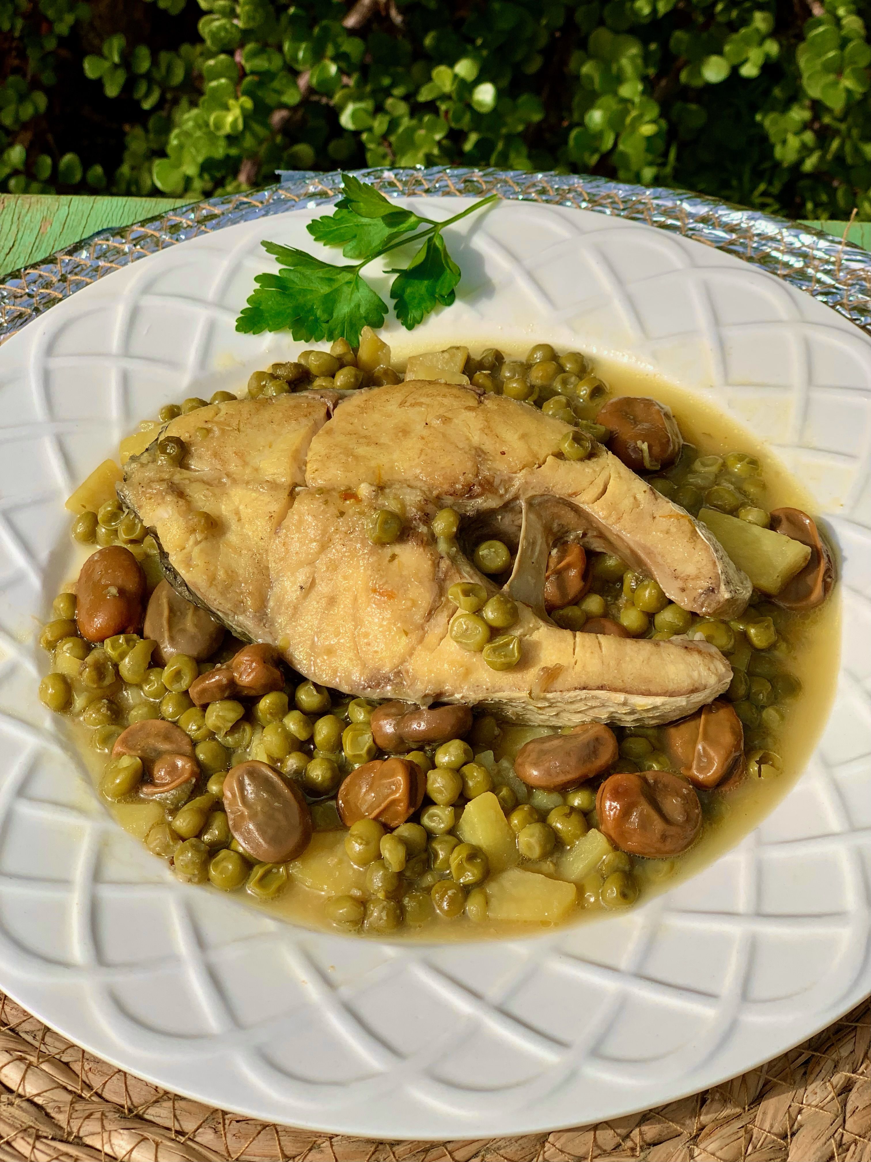 Esta semana cocinamos para vosotros, lectores de lavozdelsur.es, un guiso muy gaditano en amarillo, la corvina en amarillo con sus guisantitos, sus habas y sus patatas. Lo más habitual es cocinar esta receta con cazón, safío o raya. Nosotras la hemos cocinado con corvina, que es el pescado que encontramos ayer domingo en el mercado.
